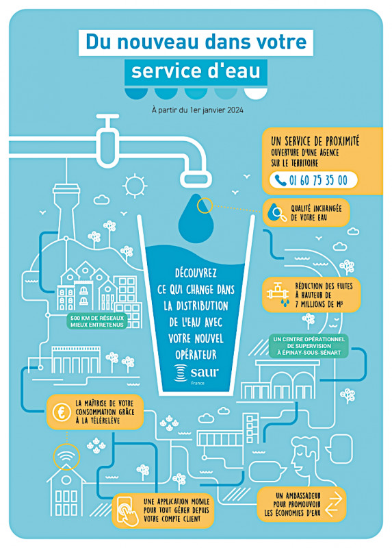 À compter du 1er janvier 2024, il n’y aura plus qu’un opérateur unique pour assurer la distribution de l’eau potable sur tout le Val d’Yerres Val de Seine. En effet, à la suite d’un appel d’offres lancé par la Communauté d’agglomération, c’est SAUR qui remplace dorénavant SUEZ et VEOLIA pour amener l’eau jusqu’à nos robinets.