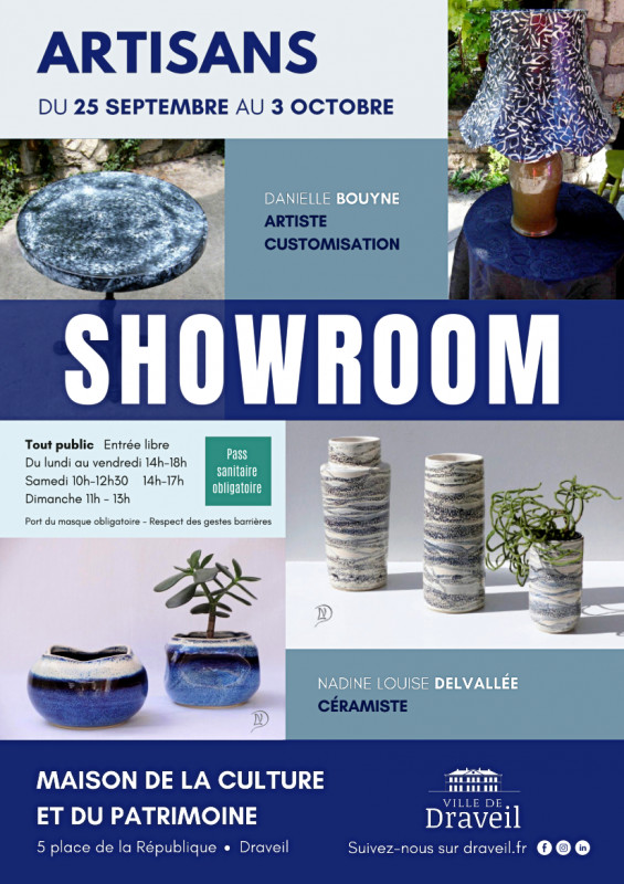 Du 25 septembre au 3 octobre, la Maison du Patrimoine et de la Culture (Place du Marché en Centre-Ville de Draveil) propose de découvrir l'artiste en customisation Danielle Bouyne et Nadine louise Delvallée, céramiste. Le SHOWROOM prend la forme d'une salle d'exposition réservée aux artistes afin de vous faire découvrir des savoir-faire et des artisans-créateurs d'exception !