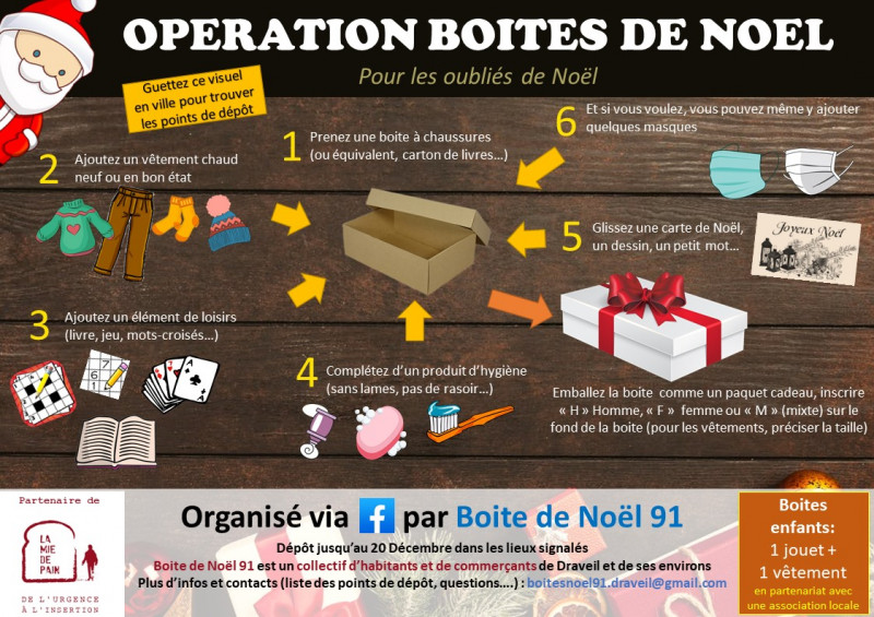 Nous vous invitons à participer nombreux à l'opération de solidarité en faveur des plus démunis "Boîte de Noël", initiée par de jeunes Draveillois. La règle est simple : vous prenez un emballage en carton, vous y ajoutez un vêtement neuf ou en bon état, un article de loisir, un produit d'hygiène et éventuellement d'autres accessoires comme des masques de protection, des serviètes hygiéniques, etc. Vous y glissez ensuite une carte de Noël, un dessin d'enfant, un petit mot de réconfort... Vous emballez votre colis comme un paquet cadeau en précisant si il est destiné à un homme ou une femme et en indiquant la taille pour les vêtements.